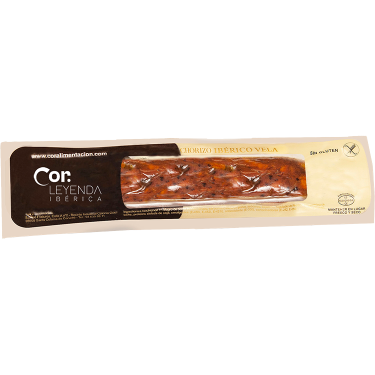 Carne de cerdo ibérico, Sal común, pimentón, leche en polvo, humectante (E-420i), dextrina, dextrosa, correctores de la acidez (E-325, E-575, E-331iii), especias, proteína de soja, antioxidantes (E-301, E-392), proteína de la leche, emulgentes (E-450i, E-452i, E- 451i), conservadores (E-252, E-250), colorante (E-120). Tripa de colágeno (no comestible).