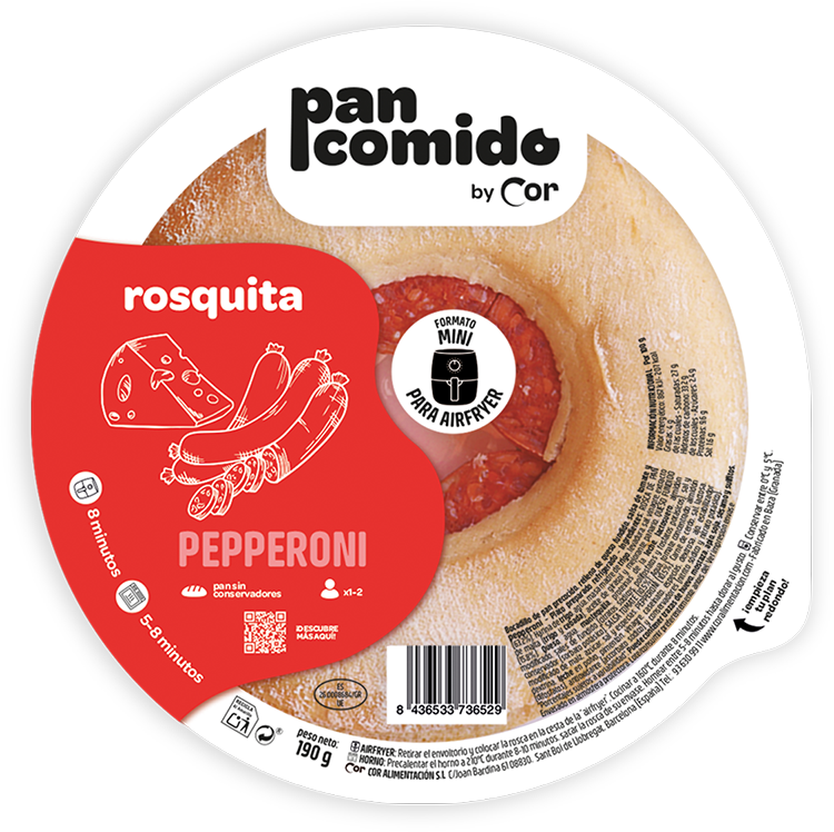 ROSCA DE PAN (63,2%): Harina de trigo, agua, masa madre de trigo, levadura, sal, vinagre, extracto de malta (trigo y cebada), aceite de girasol y mejorante panario. QUESO FUNDIDO (15,8%): Queso, agua, mantequilla, proteínas de la leche, lactosuero, almidón modificado, sales de fundido (citratos sódicos, polifosfatos y fosfatos potásicos), sal y conservador (sorbato potásico). SALSA TOMATE (10,5%): Agua, tomate concentrado, almidón modificado de maíz, azúcar, sal y especias. PEPPERONI (10,5%): Carne de cerdo, sal, lactosa, dextrina, leche en polvo, pimentón, vinagre, caseinato, especias, dextrosa, ajo, estabilizador (difosfatos), antioxidante (ascorbato sódico) y conservadores (nitrito sódico y nitrato potásico). *Porcentajes sujetos a variabilidad*