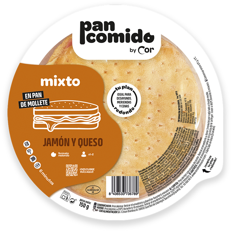 PAN DE MOLLETE (58%): Harina de trigo, agua, masa madre de trigo, manteca de cerdo (ácido cítrico, ésteres ácidos grasos de ácido ascórbico y tocoferoles), sal, levadura, vinagre, extracto de malta (trigo y cebada), y mejorante panario (carbonatos cálcicos, ésteres mono y diacetiltartárico de los mono y diglicéridos de ácidos grasos y enzimas). JAMÓN COCIDO (22,6%): Jamón de cerdo (70%), agua, sal, azúcar, aromas, estabilizantes (trifosfatos, sorbitol y carragenanos), antioxidantes (eritorbato sódico y citrato sódico) y conservador (nitrito sódico). QUESO FUNDIDO (19,4%): queso, agua, mantequilla, proteínas de la leche, lactosuero, almidón modificado, sales de fundido (citratos sódicos, polifosfatos y fosfatos potásicos), sal y conservador (sorbato potásico). *Porcentajes sujetos a variabilidad*