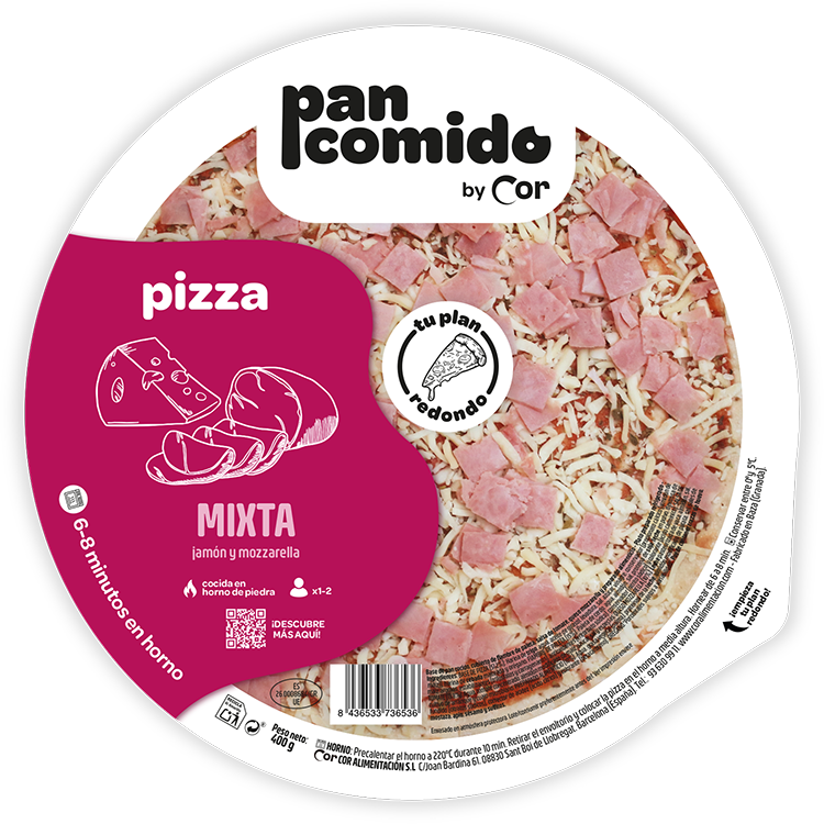 BASE DE PIZZA (51,2%): Harina de trigo, agua, aceite de girasol, levadura, sal, azúcar, vinagre, conservador (propionato cálcico (almidón de maíz)), harina de cebada malteada y orégano. FIAMBRE DE PALETA (15%): Paleta de cerdo, agua, almidón, sal, proteína de soja, leche en polvo, dextrosa de maíz, aromas, estabilizantes (trifosfatos y carragenanos), antioxidantes (eritorbato sódico), conservador (nitrito sódico) y colorante (ácido carmínico). SALSA DE TOMATE (13,8%): Agua, tomate concentrado, almidón modificado de maíz, azúcar, sal y especias. QUESO MOZZARELLA (10%): Leche pasteurizada de vaca, almidón, sal, cultivo de arranque y cuajo microbiano. PREPARADO ALIMENTICIO (10%): Agua, grasa vegetal (palma), proteínas de la leche, almidón modificado de patata, sal, sales de fundido (citratos sódicos), corrector de acidez (ácido cítrico) y colorante (betacaroteno). ORÉGANO. *Porcentajes sujetos a variabilidad.