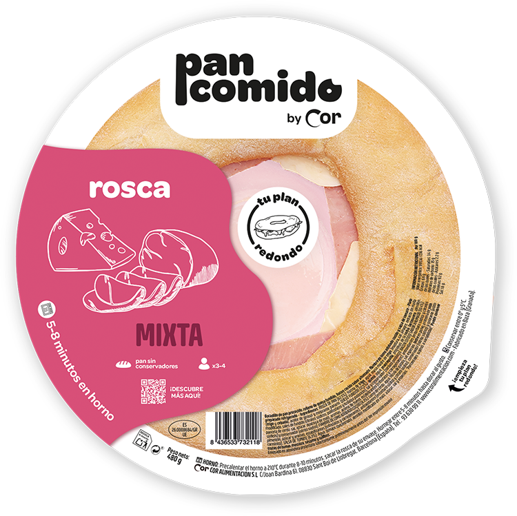 ROSCA DE PAN (62,5%): Harina de trigo, agua, masa madre de trigo, levadura, sal, vinagre, extracto de malta (trigo y cebada), aceite de girasol y mejorante panario. JAMÓN COCIDO (18,7%): Jamón de cerdo (70%), agua, sal, azúcar, aromas, estabilizantes (trifosfatos, sorbitol y carragenanos), antioxidantes (eritorbato sódico y citrato sódico) y conservador (nitrito sódico). QUESO FUNDIDO (12,5%): Queso, agua, mantequilla, proteínas de la leche, lactosuero, almidón modificado, sales de fundido (citratos sódicos, polifosfatos y fosfatos potásicos), sal y conservador (sorbato potásico). SALSA DE TOMATE (6,3%): Agua, tomate concentrado, almidón modificado de maíz, azúcar, sal y especias. *Porcentajes sujetos a variabilidad*
