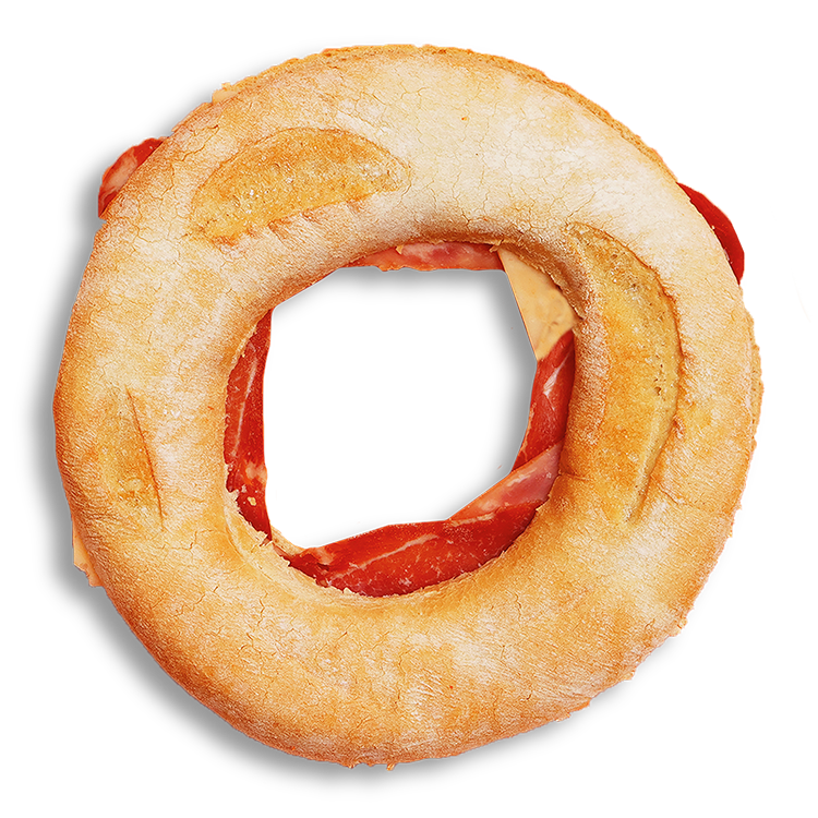 Pan precocido redondo y crujiente relleno de palea duroc, bacon y queso