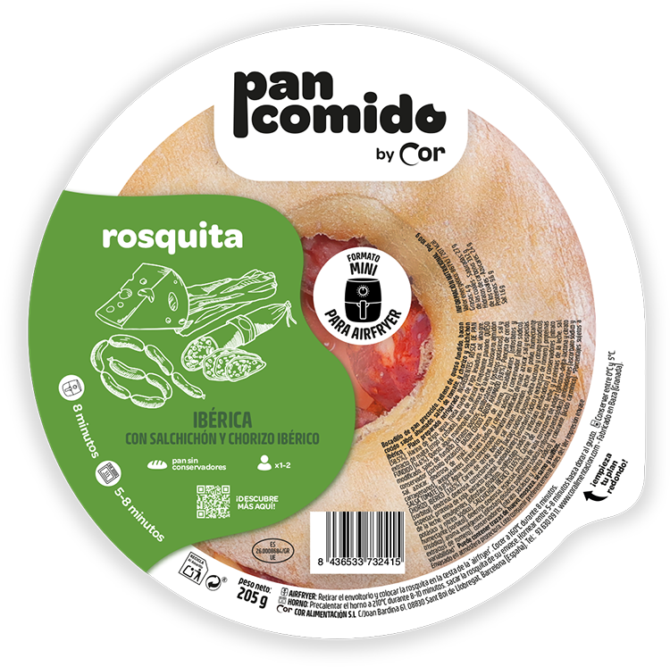 ROSCA DE PAN (58,5%): Harina de trigo, agua, masa madre de trigo, levadura, sal, vinagre, extracto de malta (trigo y cebada), aceite de girasol y mejorante panario. QUESO FUNDIDO (14,6%): Queso, agua, mantequilla, proteínas de la leche, lactosuero, almidón modificado, sales de fundido (citratos sódicos, polifosfatos y fosfatos potásicos), sal y conservador (sorbato potásico). BACON COCIDO SABOR AHUMADO (9,8%): Panceta de cerdo, sal, azúcar, dextrosa de maíz, aromas, aroma de humo, estabilizantes (trifosfatos y carragenanos), antioxidantes (eritorbato sódico y citrato sódico) y conservador (nitrito sódico). SALSA TOMATE (9,8%): Agua, tomate concentrado, almidón modificado de maíz, azúcar, sal y especias. CHORIZO IBÉRICO (3,65%): Carne de cerdo ibérico, sal común, pimentón, leche en polvo, humectante (sorbitol), dextrina, dextrosa, correctores de acidez (lactato sódico, glucono-delta-lactona y citrato trisódico), especias, proteína de soja, extracto vegetal, antioxidantes (ascorbato sódico y extractos de romero), proteínas de la leche, emulgentes (difosfato disódico, polifosfato sódico y trifosfato pentasódico) y conservadores (nitrato potásico y nitrito sódico). SALCHICHÓN IBÉRICO (3,65%): Carne de cerdo ibérico, leche y proteínas de la leche, sal, humectante (sorbitol), dextrina, dextrosa, especias, proteína de soja, correctores de acidez (glucono-delta-lactona y citrato trisódico), aroma, emulgentes (difosfato disódico, polifosfato sódico y trifosfato pentasódico), antioxidantes (ascorbato sódico y extractos de romero), conservadores (nitrato potásico y nitrito sódico) y colorante (ácido carmínico). *Porcentajes sujetos a variabilidad*