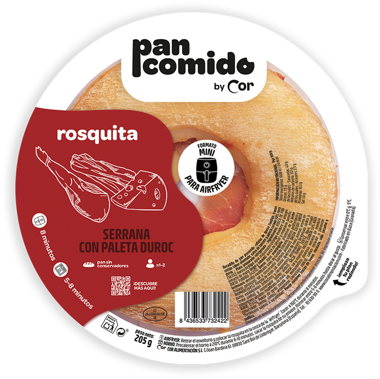 ROSCA DE PAN (58,5%): Harina de trigo, agua, masa madre de trigo, levadura, sal, vinagre, extracto de malta (trigo y cebada), aceite de girasol y mejorante panario. QUESO FUNDIDO (14,6%): Queso, agua, mantequilla, proteínas de la leche, lactosuero, almidón modificado, sales de fundido (citratos sódicos, polifosfatos y fosfatos potásicos), sal y conservador (sorbato potásico). BACON COCIDO SABOR AHUMADO (9,8%): Panceta de cerdo, sal, azúcar, dextrosa de maíz, aromas, aroma de humo, estabilizantes (trifosfatos y carragenanos), antioxidantes (eritorbato sódico y citrato sódico) y conservador (nitrito sódico). SALSA TOMATE (9,8%): Agua, tomate concentrado, almidón modificado de maíz, azúcar, sal y especias. PALETA CURADA 50% RAZA DUROC (7,3%): Paleta de cerdo curada, sal, maltodextrina, dextrosa, extracto de levadura, conservador (nitrito sódico), antioxidante (ascorbato sódico), cultivo iniciador y pimentón. *Porcentajes sujetos a variabilidad*