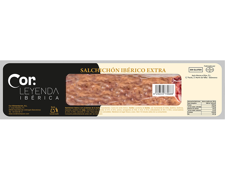 Carne de cerdo ibérico, leche y proteínas de la leche, sal, humectante (E-420i), dextrina, dextrosa, especias, proteínas de soja, correctores de acidez (E-575 y E-331), aroma, emulgentes (E-450i, E-452i y E-451i), antioxidantes (E-301 y E-392), conservadores (E- 252 y E-250) y colorante (E-120). Envoltorio no comestible (tripa natural de cerdo).
