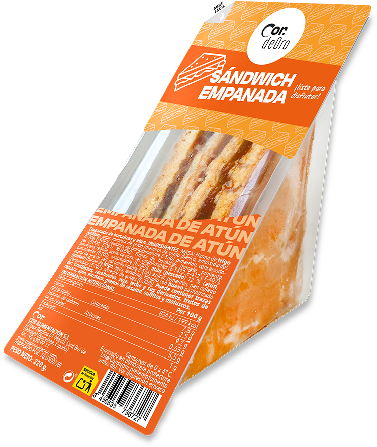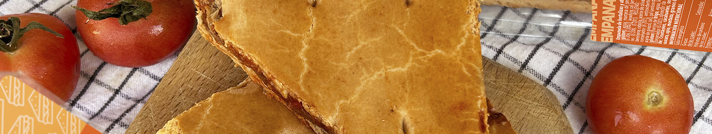 MASA: Harina de trigo (gluten), agua, manteca de cerdo [manteca de cerdo ibérico, antioxidantes (E-306, E-304i)], levadura, sal (antiglomerante E-536), pimentón, conservadores (E-200, E-281). RELLENO: Fritada de hortalizas [tomate, pimiento, berenjena, cebolla, aceite de oliva, sal, estabilizantes (E-1422, E-412 y E-407), onservador (E-202), antioxidante (E-330)], atún (pescado) 12 %, (atún, aceite de girasol, sal), sal (antioxidante E-536), azúcar, pimentón, pan rallado (gluten) (harina de trigo, agua, levadura). Pintado con huevo pasteurizado [conservador (E-202), corrector de acidez (E-330)].