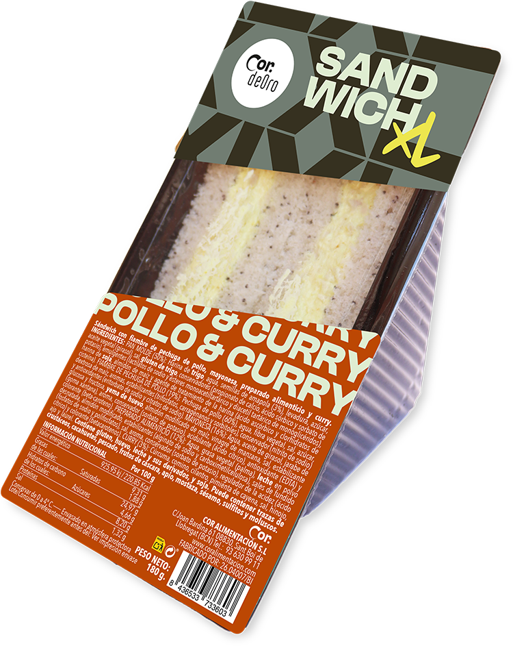 PAN MOLDE (50%): Harina de trigo, agua, semillas de Amapola (3%), levadura, azúcar, aceite vegetal de girasol, sal, gluten de trigo, conservadores (E-282, E-200, E-202), emulgentes (E-481, E-472e), harina de soja, almidón de maíz y agente de tratamiento de la harina (E-300, E920). PECHUGA POLLO (19%): Pechuga de pollo (60%), agua, fibra vegetal, sal, azúcar, dextrosa de maíz, aromas, estabilizantes (E-451, E-407 y E-420), antioxidantes (E-331 y E-316) y conservador (E-250). MAYONESA (16%): Agua, aceite de girasol, almidón modificado de maíz (estabilizante (E1422)), jarabe de glucosa y fructosa, yema de huevo, vinagre de uva, sal, aroma, acidulante (E-330), conservador (E-202), antioxidante (E-385) y colorante (E160a (i)). PREPARADO ALIMENTICIO (12%): Agua, grasa vegetal (palma), leche en polvo desnatada, almidón modificado, estabilizantes (E-401, E-466), sales de fundido (E-339, E-452), sal, aroma, conservante (E-202), regulador de acidez (E-330) y colorante (E-160a).