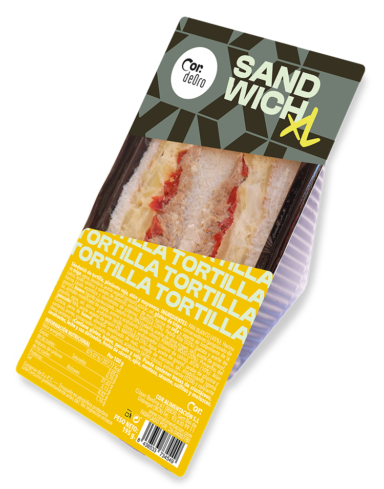 PAN BLANCO (45%): Harina de trigo, agua, levadura, aceite vegetal (girasol), azúcar, sal, gluten de trigo, conservadores (E-282, E200 y E-202), almidón de maíz, harina de soja y agente tratamiento de la harina (E-300). TORTILLA (20%): Patata frita (51%) (patata y aceite de girasol), huevo líquido pasteurizado, cebolla frita (8%) (cebolla, aceite de oliva virgen, sal), aceite de girasol, sal, huevo en polvo, estabilizantes (E-407, E-410, E-415 y E-508), almidones modificados, maltodextrina, aceite de oliva y acidulante (E-330). PIMIENTO ROJO (20%): Pimientos del piquillo, agua, sal, azúcar, acidulante (E-330) y endurecedor (cloruro de calcio). ATÚN (10%): Atún (pescado) 96%, aceite vegetal girasol 4%; MAYONESA (5%): Agua, aceite de girasol, jarabe de glucosa y fructosa, yema de huevo, almidón modificado de maíz, vinagre de vino, sal, estabilizante (E-415), aroma, conservador (E-202), acidulante (E-330), antioxidante (E-385) y colorante (E-160a(i)).